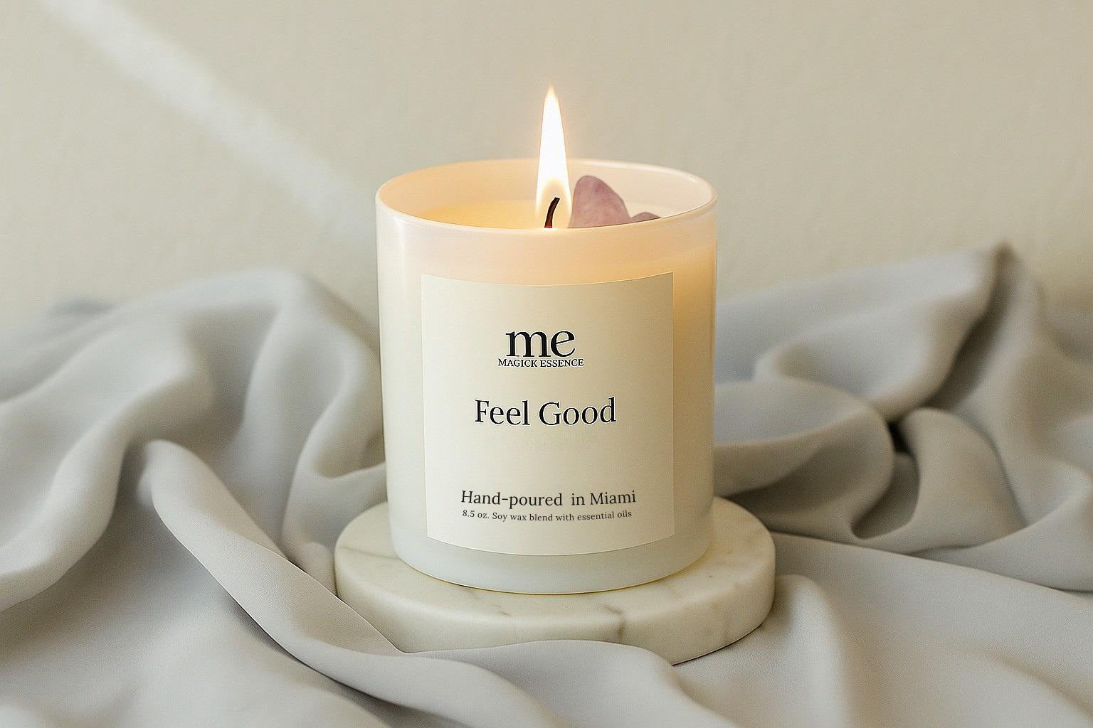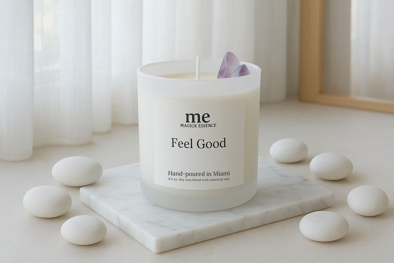 “To live in the magick” – FEEL GOOD is an intentioned candle crafted with an intense and earthy blend of soy wax and essential oils. Its purpose is to guide you along the magical path of fulfillment, enveloping you in a sense of well-being and connection with the ALL.