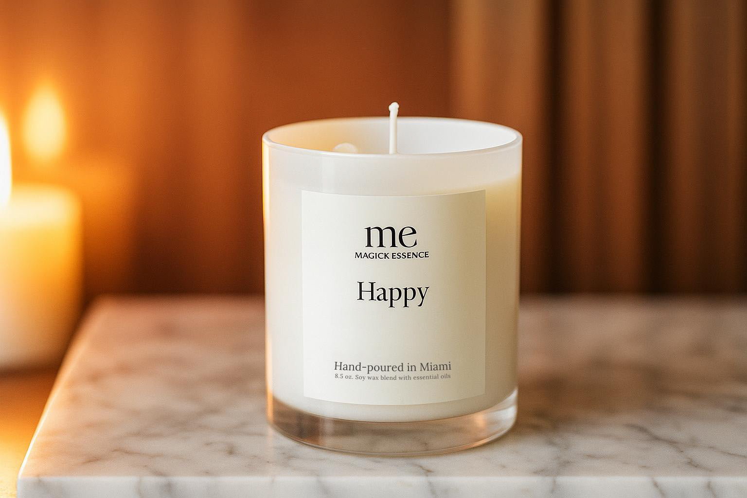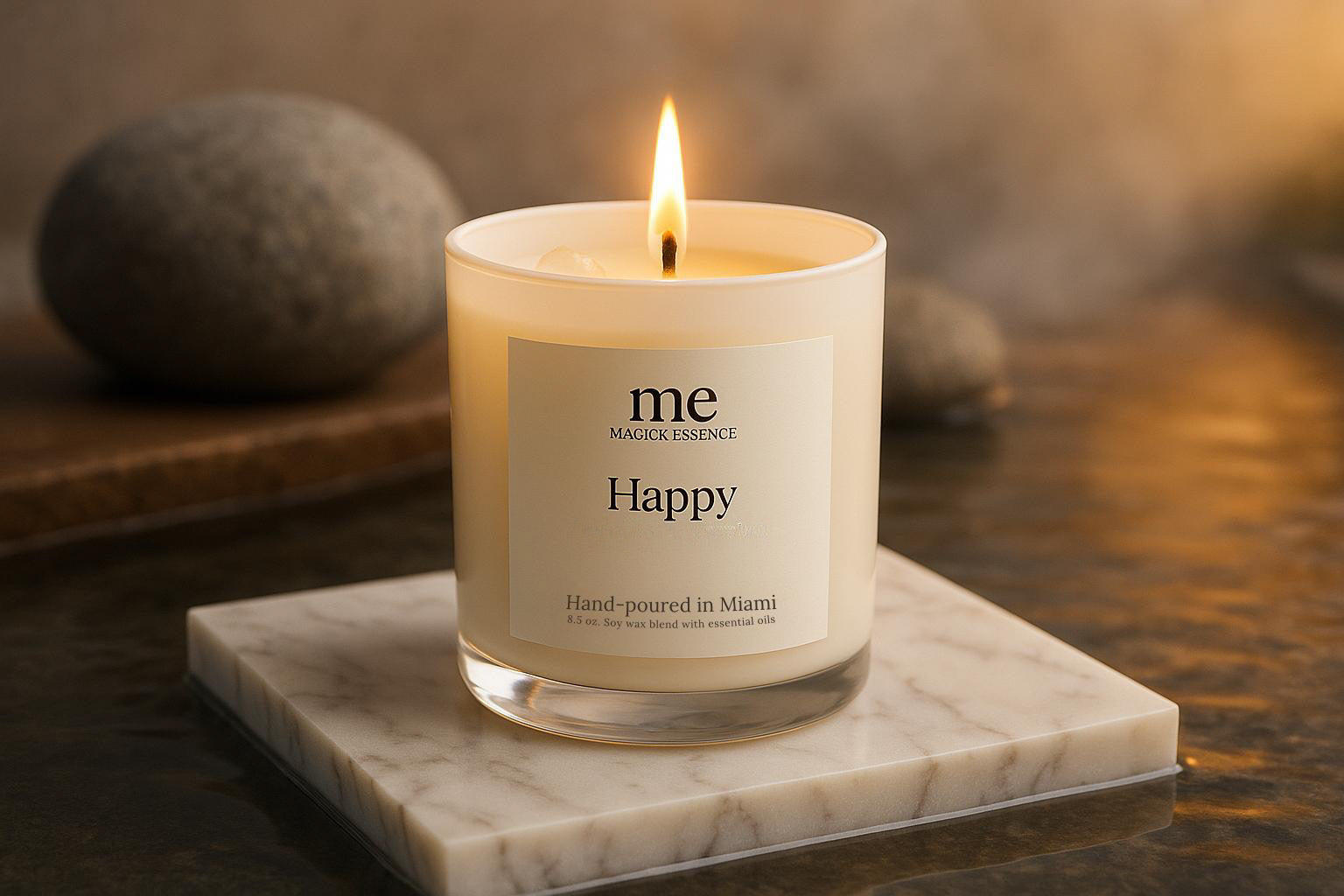 “Para vivir en la magia” – HAPPY is an intentioned candle crafted with a delicate blend of soy wax and essential oils, designed to guide you along the magical path of well-being and happiness.